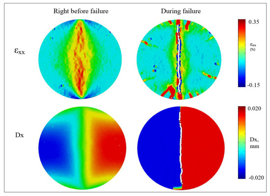 Considering the comparison between two distinct stages of the failure process, such as, right before failure and during failure of the sample, can be utilized to investigate the possible crack initiation locations as shown in Figure 15. In the images right before the failure stage, it was evident that the intensity of horizontal strain accumulation (εxx) was greater in the central region compared to the boundary of the sample. During failure, central crack propagation was observed up to the region where strain accumulated greater, and not near the loading points. Similarly, the horizontal displacement (Dx) plot right before failure showed that the central region was being pulled apart (by tension) in two opposite directions, while the horizontal displacement was less in the contact regions. Therefore, the generated cracks that were initiated from the center or central region of the sample substantiated the validity of the indirect tensile testing based on the fracture mechanics theory. Comparison of analytical, numerical and experimental results using DIC was in considerable agreement, so the simulation model based on the experimental investigation is effective at predicting the deformation behavior of rocks. The wider difference between the two approaches was found near to the loading points, as it was this zone that was more prone to stress concentrations, which could be addressed by future research.