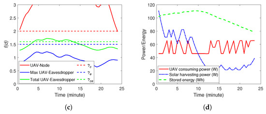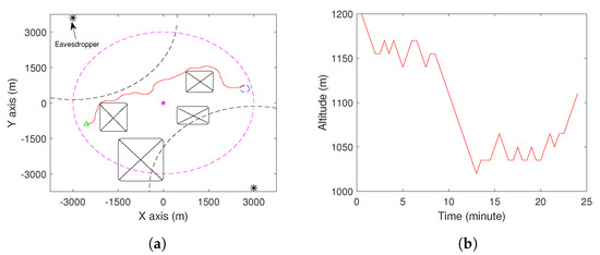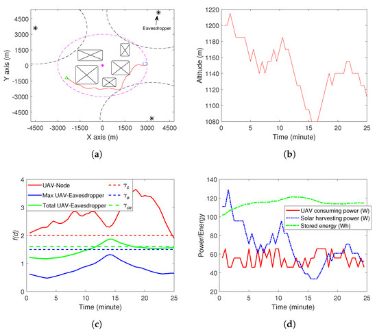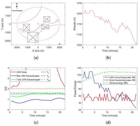 In this section, we demonstrate the effectiveness of the proposed method via computer simulations. The parameters used are summarized in Table 2. We considered two simulation environments, as shown in Figure 1 and Figure 2. In Figure 1, there are two eavesdroppers and four no-fly zones, while, in Figure 2, there are three eavesdroppers and five zo-fly zones. The ground node locates at (0,0). The UAV starts from the initial position, which is shown by the green triangle in Figure 1a and Figure 2a. The destination set is shown by a blue circle on the right side of Figure 1a and Figure 2a. In Figure 1a and Figure 2a, we also demonstrate some dash lines on the plane of , i.e., the ground. The purple one indicates the area within which the ground node can effectively recover the sent data by the UAV. The black dash lines represent the area within which the eavesdroppers (marked by the black squares) can recover the captured data. Starting from the initial position, the UAV moves along the red trajectory and reaches the destination set in 22 min in environment 1 and 23.5 min in environment 2, which are before the due time. The altitude of the UAV during the movement is shown in Figure 1b and Figure 2b. The communication between the UAV and the ground node is good, as shown in Figure 1c and Figure 2c, and this trajectory avoids the individual and collaborative eavesdropping (see Figure 1c and Figure 2c). Finally, the energy consumption of the UAV, the solar energy harvesting and the stored amount of energy are shown in Figure 1d and Figure 2d. Note that the simulations were conducted on a normal PC with Inter(R) Core(TM) i7-8565U CPU @ 1.8GHz, 1.99GHz and 8G RAM. The average time to find the trajectory was about 3–5 s. Specifically, for the simulation in Environment 1, the algorithm generated about 800–1000 samples. The number of samples generated changed in each simulation as the RRT-based algorithm is a random method. For Environment 2, the algorithm generated more samples, i.e, 10,000–13,000. The reason is that Environment 2 (three eavesdroppers and five no-fly zones) is more complex than Environment 1 (two eavesdroppers and four no-fly zones). Thus, there were more infeasible samples generated in Environment 2.