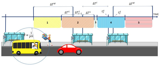 Let us consider the scenario depicted in Figure 5; our goal is to count the number of people on the bus and to know how many people board and alight from the bus during the last stop. To this, we define the set of bus stops , so that for each stop z, we can define the time of arrival at the bus stop and the time of departure from it ; then, we call time spent, the time interval the bus spends at each stop, which can be identified as follows: