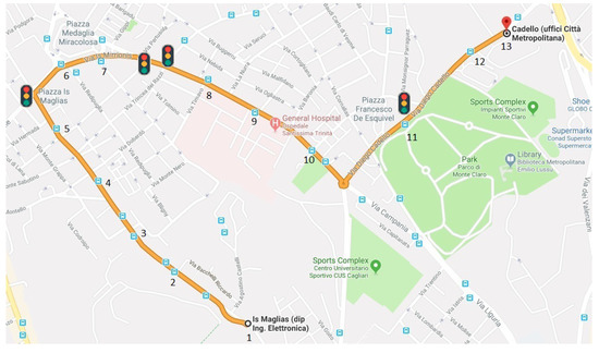 The experiments were performed in the city of Cagliari, Italy. To limit their randomness, we made use of a car to simulate an existing bus path both in the bus stops’ positions and for their time spent. The car’s path is shown in Figure 7, which also highlights the 13 stops considered. The number of Wi-Fi devices involved is limited to 8, with three of them implementing the randomization of the MAC address. The events of people boarding and alighting from the bus were simulated by switching on and off the Wi-Fi interface of the devices respectively. The plan of the experiments is shown in Table 5, which represents for each device, labelled from device A to device H, the origin’ and destination’ stop; Table 5 also shows the results of the three tests performed, that will be discussed below, highlighting in pale blue color the cells where something wrong happened. All the experiments were carried out before or during the lunch break, in moderate traffic conditions. The path is around 2.4 km long and has three traffic lights: the car needed around 15 min to travel it, which is an average time also for a passenger travelling on the bus.