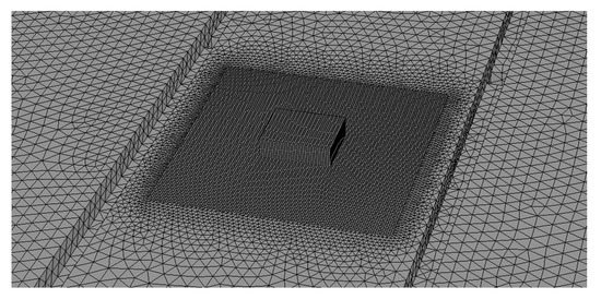The numerical model was discretized with an unstructured tetrahedral mesh (maximum element dimension δi = 0.4 m) in most of the domain and with a structured Cartesian mesh (maximum element dimension δx = 0.1 m) in the area above the fire and in the proximity of the vents. The meshes were connected with the use of a mesh growth function, with a 1.30 mesh growth factor. A sample view of the numerical mesh in the vicinity of the ventilator (the area where sprinkler activation time was assessed) is shown in Figure 2.
