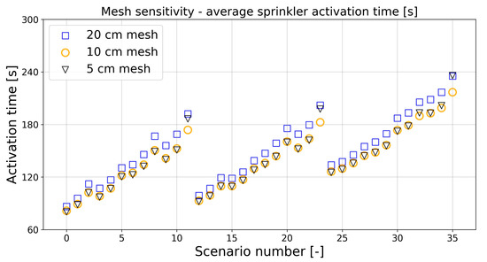 The mesh was created following the guidelines presented in [37] and was verified following a mesh sensitivity analysis. For this purpose, one case (fire scenario 2, closed vent) was simulated on three different models. Coarse mesh refers to the case with δx = 0.2 m, medium mesh refers to a case with δx = 0.1 m, and fine mesh refers to a case with δx = 0.05 m in the proximity of the ventilator. It was found that the decrease of mesh size below δx = 0.1 m did not lead to a different outcome in terms of the resulting sprinkler activation time (with the exception of scenarios 12, 24, and 36). On the other hand, increasing the mesh size to δx = 0.2 m resulted in significant differences in activation time for almost all of the scenarios. In consequence, the medium (δx = 0.1 m) mesh was chosen for the rest of the analyses as the best compromise between the quality and the numerical costs. The results of the sensitivity analysis are summarized in Figure 3.