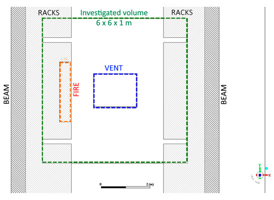 A 3D model of a warehouse (L: 60 m, W: 40 m, H: 8 m) facility was created. The storage height was chosen as 6 m. A view of the model and the fire source is shown in Figure 1. The facility was equipped with natural smoke control system dimensioned following NFPA 204 guidance [32]. Six vents, with dimensions of 1.80 × 1.50 m, were uniformly distributed on the warehouse roof. The opening angle for sanitary mode operation was chosen as 15°.