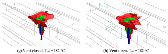 Furthermore, the novel approach allowed for the assessment of the statistics of the number of sprinklers activated within a defined region in terms of the percentage of cells in which the sprinklers would have activated. A 100% sprinkler activation meant that a sprinkler would activate within the time of simulation, located in any given place within the analyzed volume. The results of this calculation are shown in Figure 7. It can be concluded that for most of the cases with a closed vent (excluding Tact = 182 °C, RTI = 20–200, C = 1–2), the sprinklers would have activated in all of the cells within the predefined region for all fire scenarios. A similar conclusion may be formed for the cases with open vents and low-temperature sprinklers (Tact = 68 °C and Tact = 92 °C). As shown in Figure 7, some differences can be found in the time of activation; however, the smoke venting did not prevent the sprinkler operation. In case of high-temperature sprinklers (Tact = 141 °C and Tact = 182 °C), a significant number of devices (12%–61%) were not activated within the duration of the simulation (10 min). This can be interpreted as a significant effect of venting action on sprinkler performance, especially on the sprinklers located further away from the fire (e.g., the second row of sprinklers). In many performance-based design projects, the activation of such sprinklers is considered necessary for controlling the size of the fire. If the activation of the second row is delayed, the fire may grow to a size that exceeds the control capacity of the sprinkler system.