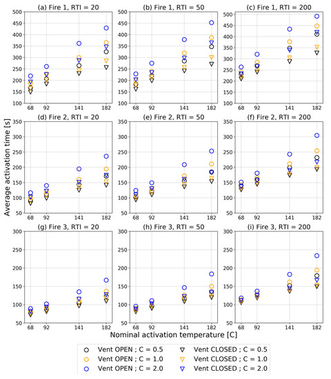Average time of sprinkler activation (s) within the predefined region (Figure 4) for all performed simulations. Different plots (a–i) represent different Fire scenarios (1–3) and different RTI values (20, 50 and 200), as described in the title above each plot