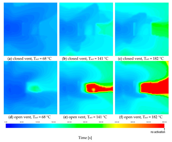 A more detailed spatial investigation of the sprinkler activation events was possible with the use of 2D activation maps. Figure 8 presents comparison of sprinkler activation time in a plot 20 cm under the ceiling for fire scenario 2 and Tact = 68 °C, Tact = 141 °C, and Tact = 182 °C sprinklers (all RTI = 20, C = 1). In this plot, it can be observed that the existence of the vent itself disturbed the flow of the ceiling jet, and, in consequence, the activation time was not symmetrical, as it would be if it were obtained with simple hand calculations.