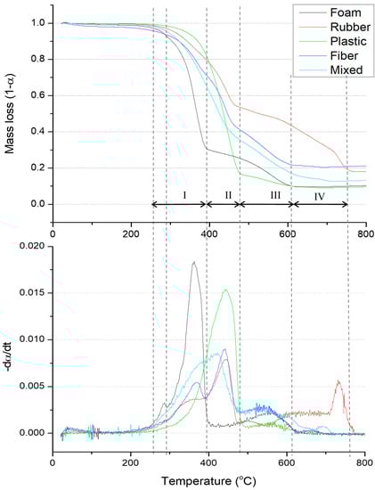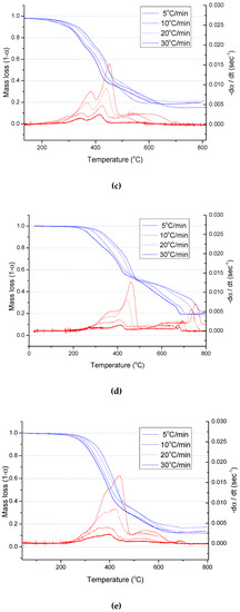 In order to obtain kinetic parameter determination, a TGA analyzer was used. The data are presented on the following figures as sample conversion (1 − α) and mass change rate (dα/dt) as a function of temperature (T). Figure 1 shows the TGA results in the order of sponge foam, plastic, fiber, rubber, and mixed ASR. The figure shows the results of the experiment according to the heating rate with the horizontal axis as the temperature. The blue line shows the tendency of mass to decrease with increasing temperature in all samples. The mass change rate values, represented by the red line, represent peaks at specific temperatures, indicating that thermochemical conversion occurs under a nitrogen atmosphere and a rapid change in mass of the sample occurs. In addition, it can be seen that peaks are formed at different temperature ranges according to the types of samples. The sponge foams and plastic showed rapid degradation around 400 °C, while the other samples, rubber and fiber, showed graphs of mass loss with a relatively gentle slope. Even in the mass loss rate peak of the red line, foam and plastic have a single maximum peak. Fiber and rubber show about three peaks depending on the temperature. This means foam and plastic have simpler compounds than fiber and rubber. The mixed sample of these four materials graph, Figure 1e shows a major mass reduction peak up to near 480 °C and a gentle mass loss rate peak up to around 725 °C again. The shape of the mixed sample graph looks similar to the superimposed graph of the other four materials. In Figure 1, it can be observed that as the heating rate increases, the mass reduction rate of the reactant to the temperature is skewed to the right. At the same time, the peak of the red graph showing the rate of mass change shows a right bias as the heating rate rises. This is a common phenomenon in research that investigates the thermal decomposition of polymers. This is known to be due to the difference in the activation energy of the reactants [31]. The change of mass loss ratio and mass change rate with the temperature of mixed ASR is shown in Figure 1e. This curve trend is shown to be similar to the graph trends of plastics and fibers, which make up a large proportion of the mixed ASR.