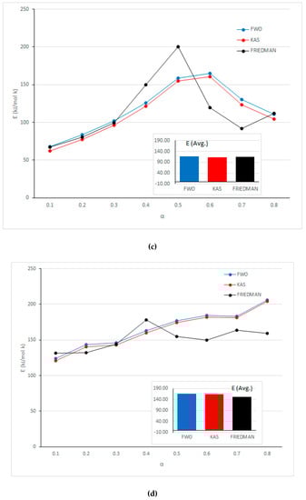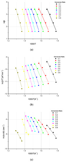 It has to be noted that the analysis does not provide the knowledge of the reaction model. The Friedman method uses the natural logarithm of the reaction conversion rate as a function of its corresponding temperature at different conversion rates, which is obtained by simple rearrangement of Equation (6):