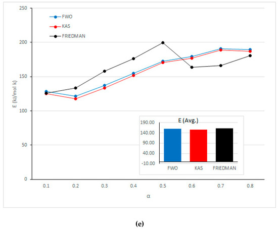 Figure 4 shows the activation energy from each model as mass conversion increases. the sample mass conversion rate range 0.1 to 0.8 for each sample: (a) sponge foam; (b) plastic; (c) rubber; (d) fiber; and (e) mixed sample, the mean energy values are shown in bar graphs. The activation energy values calculated from the FWO and KAS models show nearly identical patterns throughout the mass conversion rate. On the other hand, the activation energy value calculated in the Friedman model is very different from that of FWO and KAS models. Sponge foams (a) and rubber (c) decrease the activation energy from the mass conversion rates of 0.7 and 0.6, respectively, as the mass conversion rate increases, but in other samples, the activation energy value increases as the mass conversion rate increases. In the mixed sample (e), the patterns of activation energy graphs of the other different samples appeared to be complex. In particular, the graph of the Friedman model was lower than that of the FWO and KAS models after the conversion rate of 0.6 due to the effects of the above rubber and fiber. The activation energies of plastics and rubbers were 105.39 kJ/mol and 115.20 kJ/mol, respectively. The sponge foams and fibers were 172.59 kJ/mol and 160.30 kJ/mol, respectively. The mixed sample, in which the four samples were mixed in proportion, had an activation energy value of 159.56 kJ/mol, which was almost similar to that of the fiber.