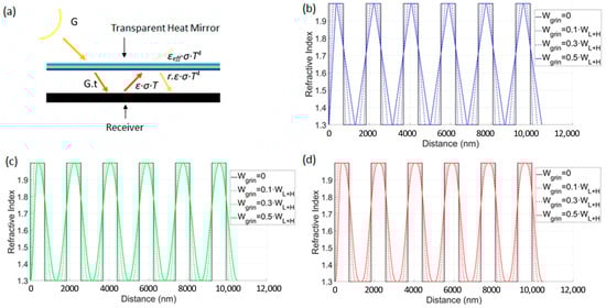 (a) Schematic diagram of a solar receiver with a transparent heat mirror cover. Refractive index profile of one-dimensional (1-D) transparent photonic crystal heat mirrors with (b) linear (HL[LLHL]5), (c) cubic (HC[LCHC]5), and (d) quintic (HQ[LQHQ]5) interfacial profiles for different Wgrin values equal to 0.1·WL+H to 0.5·WL+H.