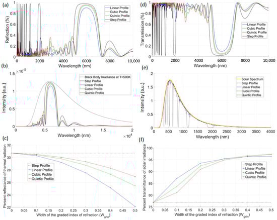 In this work, thin film theory [29,30] is implemented in MATLAB code and applied to calculate the reflectance, transmittance, and temperature-determining factor, t/εeff, for the 1-D TPCHMs that are shown in Figure 1. The calculations were performed by increasing the wavelength of the solar and thermal radiation in increments of 10 nm. The graded refractive index profiles were divided into 20 discrete layers to perform the calculations, wherein the optical properties of these layers is constant. Approximating each graded interface as 20 layers with increasing/decreasing indices of refraction is sufficient; for example, increasing to 100 layers resulted in a change in the reflectance and transmittance values of less than 1%.