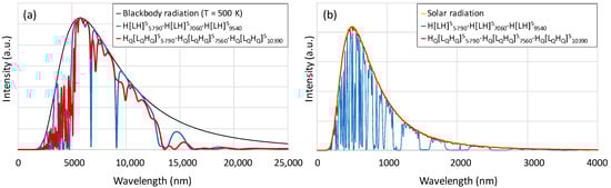 For the TPCHMs considered herein, the greatest amount of blackbody reflection is achieved using H[LH]55800, however H[LH]55800 transmits the least amount of solar radiation. The transmittance spectra for H[LH]55800, HL[LLHL]55800, HC[LCHC]55800, and HQ[LQHQ]55800, for the case when Wgrin = 0.5·WL+H, is shown for the spectral region extending from 100 to 10,000 nm in Figure 2d. A number of intense dips in the transmittance spectra of H[LH]55800, being caused by higher order Bragg-reflectance peaks, can be seen over the solar spectral region. In comparison, the dips in the transmittance spectra over the solar spectral region are much less pronounced for HL[LLHL]55800, HC[LCHC]55800, and HQ[LQHQ]55800. The interfacial graded index of the refraction profiles within HL[LLHL]55800, HC[LCHC]55800, and HQ[LQHQ]55800 increase the transmission of light with wavelength in the solar spectral range, thereby mitigating the effects of the higher order Bragg-reflectance peaks. For light with longer wavelengths, such as where the blackbody emission peak occurs at 5800 nm, the interfacial graded index of refraction profiles ‘appears’ to be closer to that of a quarter-wave step profile. At these longer wavelengths, the first order Bragg-reflectance peak is retained by HL[LLHL]55800, HC[LCHC]55800, and HQ[LQHQ]55800, although with some reduction in intensity in comparison to H[LH]55800.