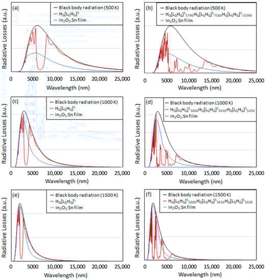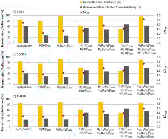 Thus far, the TPCHMs that are discussed herein were designed to work with a solar receiver operating at a temperature of 500 K. In general, TPCHMs can be designed to work with solar receivers that operate at a given temperature, T = Tx. For example, a quarter-wave dielectric mirror can be designed, wherein the thicknesses of its H and L layers are set to position its Bragg reflectance peak to coincide with the peak of the radiation spectra emitted from a receiver operating at Tx. The interfacial index of refraction profiles can then be designed to be graded. The optimal peak position for each mirror within the stack can be iteratively determined for cases in which the TPCHM is comprised of stacked dielectric mirrors. As an example, Figure 4 shows the radiative losses for receivers operating at 500 K, 1000 K, and 1500 K, that are covered with TCPHMs that have been optimized for these operating temperatures. The interfaces within the TCPHMs considered in Figure 4 have a graded index of refraction with a quintic profile, which provide for the highest values of t/εeff considering the TPCHMs discussed with reference to Figure 1. Moreover, Figure 5 shows the percentage of the solar irradiance transmitted and thermal radiation reflected from TPCHMs covering receivers at operating temperatures of 500 K, 1000 K, and 1500 K. The percentage of the solar irradiance transmitted and thermal radiation reflected by a conventional transparent heat mirror, namely a 0.32 μm thick In2O3:Sn film deposited via e-beam evaporation, is also shown in Figure 5 for comparison [31]. Furthermore, Figure 5a–c show the value of t/εeff when the blackbody receiver is at an operating temperature of 500 K, 1000 K, and 1500 K, respectively, for each receiver cover that was considered.
