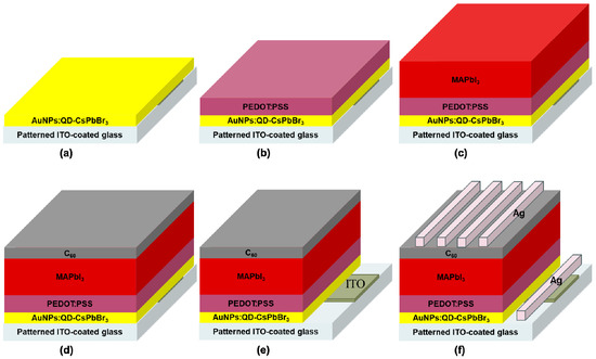Plasmonic perovskite solar cell process steps. Preparation of (a) a plasmonic gold nanoparticle:CsPbBr3 hybrid perovskite quantum dot (AuNPs:QDs-CsPbBr3) light-harvesting layer on patterned indium tin oxide (ITO)-coated glass, (b) PEDOT:PSS hole injection layer, (c) perovskite MAPbI3 active layer and (d) C60 electron transport layer; (e) Scrapping the film and defining the study area; (f) Ag electrode deposition and the plasmonic perovskite solar cell device.