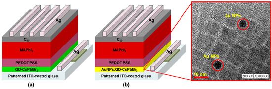 Schematic of the (a) original QD-CsPbBr3/MAPbI3 and (b) plasmonic AuNPs:QD-CsPbBr3/MAPbI3 perovskite solar cell configurations. The inset shows a TEM image of the AuNP:QD-CsPbBr3 characterization.