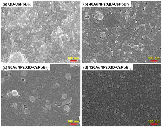 Top-view SEM images of annealed (a) QD-CsPbBr3, (b) 40AuNPs:QD-CsPbBr3, (c) 80AuNPs:QD-CsPbBr3 and (d) 120AuNPs:QD-CsPbBr3.