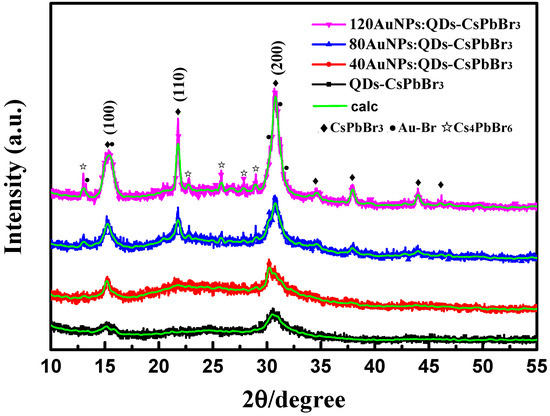 Perovskite QD-CsPbBr3 with and without the Au NPs were characterized by XRD to confirm the crystallinity influence of QD-CsPbBr3 films before and after the addition of the Au NPs. The XRD patterns of annealed QD-CsPbBr3, 40AuNPs:QD-CsPbBr3, 80AuNPs:QD-CsPbBr3 and 120AuNPs:QD-CsPbBr3 films are displayed in Figure 4. The 80AuNPs:QD-CsPbBr3 and 120AuNPs:QD-CsPbBr3 XRD patterns and the Rietveld profile refinement, using the Match program analysis software, as shown in Figures S1 and S2. According to an earlier report [41], CsPbBr3 has two phase transitions at different temperatures—one is an orthorhombic phase (lower than 88 °C) and the other is a cubic phase (higher than 130 °C for the bulk and 117 °C for the nanocrystals)—which were distinguished by the PbBr6 octahedral tilting in the orthorhombic phase. It can be seen that the annealed QD-CsPbBr3 films without Au NPs showed only two diffraction peaks, corresponding to the (100) and (200) planes. In addition, with increasing Au NP content, the crystal quality of annealed AuNPs:QD-CsPbBr3 films was better than that of the annealed QD-CsPbBr3 films without Au NPs; the (110) plane of AuNPs:QD-CsPbBr3 films gradually becomes apparent. On the other hand, it was also found that a small amount of Au NPs combined with Br to form Au—Br complex (Au2Br6) and other diffraction peaks appeared, which not only reduced the QD agglomeration and improved the crystallinity quality of the films, but also did not affect the main crystal structure of the QDs. This indicates that the Au-Br complex has a self-assembling effect on QD-CsPbBr3 to improve the film quality [42]. This is in good agreement with the SEM analysis. All the annealed AuNPs:QD-CsPbBr3 films showed three main peaks at 2θ = 15.55°, 21.55° and 30.65°, which were assigned to the (100), (110) and (200) planes, respectively. In particular, the annealed 80AuNPs:QD-CsPbBr3 and 120AuNPs:QD-CsPbBr3 films that appeared in crystal planes of (100), (110), (200), (210), (211), (220) and (300) implied the formation of the cubic CsPbBr3 (JCPDS No. 54-0752). Importantly, the weaker peaks at 12.98, 22.75, 25.78, 27.86 and 28.97° can be identified as the (110), (300), (220), (131) and (312) diffraction planes, respectively, indicating the presence of a Cs4PbBr6 phases (PDF# 73-2478). The CsPbBr3 and Cs4PbBr6 bi-phases were observed when AuNP contents increased. This means that Au NPs help the formation of Cs4PbBr6 crystals. The Cs4PbBr6 crystals exhibit a superior quantum yield and device performance than that of CsPbBr3 crystals. [43,44]