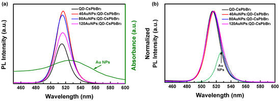 Figure 5a shows the photoluminescence (PL) spectra of annealed QD-CsPbBr3, 40AuNPs:QD-CsPbBr3, 80AuNPs:QD-CsPbBr3 and 120AuNPs:QD-CsPbBr3 films. It was observed that the PL intensity of all the AuPs:QD-CsPbBr3 films was higher than that of the QD-CsPbBr3 film without Au NPs, and the PL intensity did not increase as the Au NP amount increased. NPs can increase or decrease the overall fluorescence of QDs by plasmon resonance energy transfer, fluorescence resonance energy transfer and charge transfer. These mechanisms will determine whether fluorescence enhancement or quenching is observed in the QDs. In the case of 40AuNPs:QD-CsPbBr3, light can be coupled to the LSP modes and increase the optical energy density near the QDs, thereby enhancing absorption. Therefore, the plasmon resonance energy transfer from excited NPs to nearby QDs is dominant, which increases the luminescence of the QDs. On the other hand, in the case of adding larger amounts of Au NPs, the main reason for the fluorescence reduction and quenching of QDs is speculated to be fluorescence resonance energy transfer. This result clearly shows that the fluorescence emission of QD-CsPbBr3 was quenched by Au NPs. Since the PL spectrum of QD-CsPbBr3 and the localized plasmon absorbance spectrum (525 nm) of Au NPs overlap significantly, the PL quenching can be considered mainly as energy/charge transfer, which should enhance localized plasmon excitation more effectively [45]. This is anticipated to enhance the generation of a photocarrier in the active layer when the plasmonic AuNPs:QD-CsPbBr3 hybrid is used in perovskite solar cells. When the PL spectra were normalized (see Figure 5b), the annealed QD-CsPbBr3, 40AuNPs:QD-CsPbBr3, 80AuNPs:QD-CsPbBr3 and 120AuNPs:QD-CsPbBr3 films exhibited a green emission with a PL peak at 515–517 nm and full widths at half-maximum (FWHMs) of 21.4, 21.6, 22.4 and 24.2 nm, where the FWHMs became larger and were expected to increase light absorption. It can be observed that AuNPs:QD-CsPbBr3 generated an induced electric field under light irradiation, and QD-CsPbBr3 and Au NPs experienced plasmon coupling with each other, causing a red shift. The degree of red shift became significant with increasing amount of embedded Au NPs.