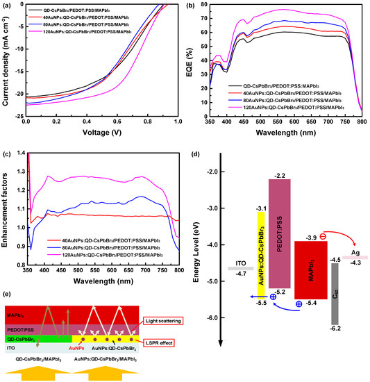 (a) Current density–voltage curve; (b) external quantum efficiency (EQE); (c) enhancement factor; (d) corresponding energy level diagram of each layer; (e) schematic diagram of the enhanced power conversion efficiency (PCE) mechanism for the plasmonic perovskite solar cells compared with that of the original cell.