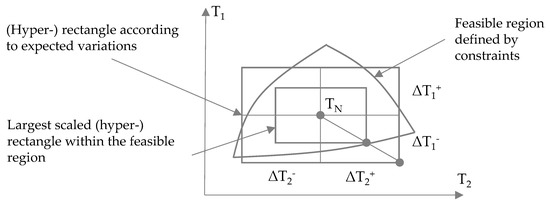 (Hyper-)rectangle with respect to expected variations and maximum scaled (hyper-)rectangle inscribed within the feasible region in the space of the varying inlet temperatures of a heat exchanger network [38].