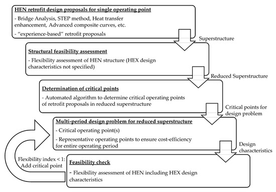 In this work, a novel framework for retrofitting multi-period HENs was developed and presented. The proposed framework divides the retrofit design process into five sub-steps, which allows for the combining of the beneficial designer interaction of graphical approaches (e.g., Pinch based) at an early stage in the design process with the efficiency of mathematical programming to derive flexible and cost-efficient retrofit measures. In this context, inefficient trial and error procedures are avoided. Additionally, by means of splitting the design process in five different sub-steps, the complexity of the sub-problems is decreased compared to the overall problem.