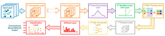 The last layer in the CNNs is usually the fully connected layer, which enables the assessment of the share of individual classes that are the result of the network operation [,]. Fully connected layers applied in CNNs mostly cooperate with softmax layers []. Their task is to determine the probability of the input batch elements belonging to one of the categories. The softmax layers’ response takes the form of a vector of probabilities and is used by the classification layer to determine the belonging of the CNN input matrix to one of the specified categories. For this purpose, the cross entropy of losses is calculated.