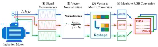 The following steps of the data preprocessing algorithm are illustrated in Figure 3. In the first step {1}, the phase currents of the IM were measured. The research assumed the possibility of fault detection after measuring only 2000 samples of the diagnostic signal, which constituted two full periods for the minimal frequency of the motor supply voltage equal to 10 Hz.