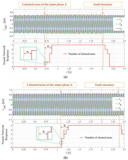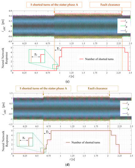 CNN on-line response during motor operation: (a) Nsh = 5, fs = 20 Hz, TL = 0.2 TN, Td = 0.0273 s, Tc = 0.1783 s; (b) Nsh = 5, fs = 20 Hz, TL = 0.6 TN, Td = 0.0085 s, Tc = 0.1985 s; (c) Nsh = 5, fs = 50 Hz, TL = 0.4 TN, Td = 0.0508 s, Tc = 0.1503 s; (d) Nsh = 5, fs = 50 Hz, TL = 0.8 TN, Td = 0.022 s, Tc = 0.1536 s: Nsh—number of shorted turns in stator windings; TN—nominal torque; TL—load torque; fs—supply voltage frequency; Td—fault detection time; Tc—fault classification time.