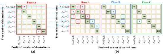 Confusion matrix for testing data: (a) CNN-1; (b) CNN-2: red envelope—phase A; blue envelope—phase B; green envelope—phase C; Nsh—number of shorted turns in stator windings.