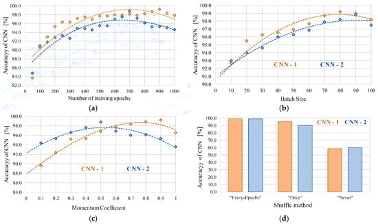 As observed in Figure 6, the impact of the training parameters on the effectiveness of individual structures is similar. The differences result from a larger number of layers in CNN-2, as well as from a much broader learning data vector. The largest differences in the accuracy of the neural detector are noticeable when the momentum factor changes. The CNN-1 structure, with a much smaller number of classes required for recognition, is characterized by higher efficiency for much higher values of the momentum coefficient (Figure 6c). The high value of this parameter during the training of the CNN-1 network resulted in a rapid decrease in the value of the loss function, and at the same time an increase in the number of learning epochs necessary to ensure maximum precision (Figure 6a). The analysis of Figure 6b shows that the size of the data batch significantly affects the training process of both developed structures. The research abandoned the standard approach to choosing the batch size as a power of two. This approach results from the fact that memory operations are optimized for processing 2n arrays, while the structures presented here did not require such accurate optimization of the training process.