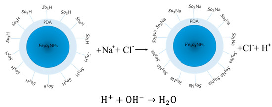 Metal nanoparticle Fe3O4 has attracted more attention because of its super paramagnetic application in solid acid catalyst support. In modern research, modified surface coatings can protect carrier materials from corrosion by strong oxidizer, acid, or alkali chemicals. The interaction between the carrier and the surface coating material depends largely on the properties of the surface material and the functional groups of the material. Polydopamine (PDA) exhibits similar characteristics to mussel secreted proteins, which contain sufficient catechin and amine groups and spontaneously form thin, surgically adhered polydopamine coatings on the surfaces of various materials. More importantly, due to a large number of active catechol and amine groups, PDA can be used as reductants and binders, so that various composite materials have good functional characteristics. With Fe3O4 as the magnetic center, its outer layer is covered with PDA, which not only protects Fe3O4, but also can more effectively connect its surface functional groups with other functionalized functional groups. Polydopamine-coated Fe3O4 nanoparticles have been exploited for use in numerous advanced applications, including the separation and enrichment of proteins in proteomic analysis, the detection of pollutants by matrix assisted laser desorption/ionization time-of-flight mass spectrometry, and magnetic solid-phase extraction adsorbent for the determination of trace polycyclic aromatic hydrocarbons in environmental samples [23]. Through a sulfonating reaction, a sulfonate group can be successfully loaded outside the carrier to make it a magnetic nano-solid acid catalyst, which can be applied to the synthesis of important compounds.