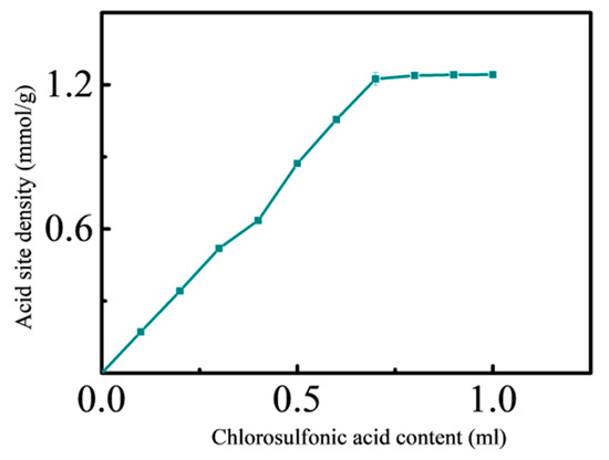 To investigate the effect of solid acid catalyst preparation conditions on the acid density of solid acid, a single factor optimization experiment was carried out. In the process of loading sulfonic groups, considering the presence of free amino groups on the surface of the support, if the amount of chlorosulfonic acid is less, the acid density of the prepared solid acid catalyst is lower. If the amount of chlorosulfonic acid is too much, when the acid density is saturated, too many sulfonic acid groups will no longer be chemically linked to the amino group on the carrier, resulting in the overuse of chlorosulfonic acid. So, it is necessary to carry out the single factor optimization experiment of the amount of chlorosulfonic acid. The experimental results are shown in Figure 2.