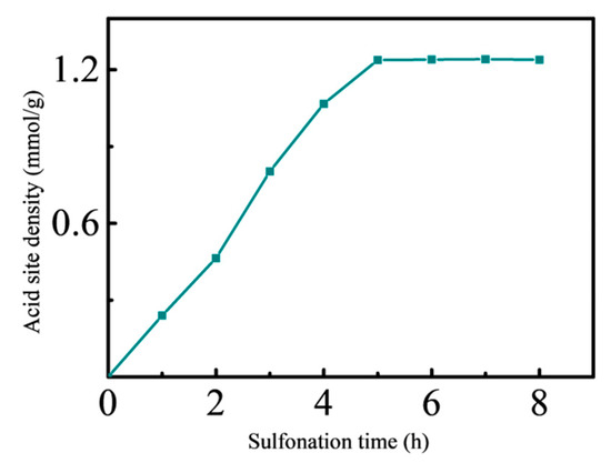 Sulfonation time determines the contact time between chlorosulfonic acid and carrier. Polydopamine adheres to the surface of Fe3O4, and the amino and sulfonic groups on the surface of polydopamine are linked by chemical bonds. It takes some time for chlorosulfonic acid to bind to the amino groups on the support, so the longer sulfonic group becomes more fully contacted with the carrier material. However, the contact time is too long can cause a waste of time. Through the optimization test results analysis, sulfonation time of five hours to obtain the highest density of carbon-based solid acid as shown in Figure 3.