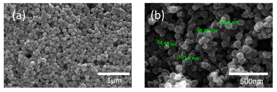 Morphology of nanoparticles was researched by scanning electron microscopy (SEM). The samples were ultrasonically dispersed in ethanol poured onto monocrystalline silicon, then SEM images were obtained at an accelerating voltage of 30 KV.