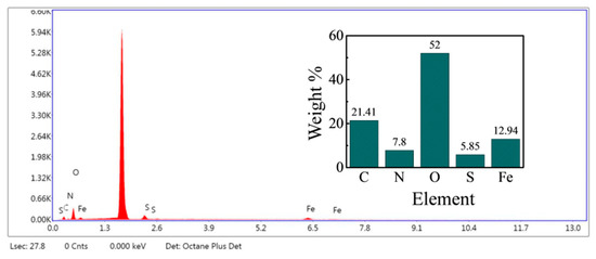 Energy dispersive X-ray spectroscopy was used to examine the surface elemental composition of the product. As shown in Figure 6, C, N, O, S, and Fe were observed. The strong peak in Figure 6 was Si element because of the presence of monocrystalline silicon. The presence of C, N, O, and S indicates that polydopamine was attached to Fe3O4, and sulfonic acid group were loaded to Fe3O4-PDA.