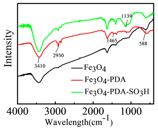 FT-IR was conducted to investigate the functional group [9] composition of the nanoparticles. As shown in the Figure 7, the feature peak at 588 cm−1 relates to the Fe-O functional group [17] vibration, proving the presence of Fe3O4. The peaks at 3410, 2930, and 1465 cm−1 can be assigned to O-H stretching, C-H stretching, and C=C stretching corresponding to the presence of functional groups -OH of phenol and -C=C-NH- in the Fe3O4-PDA [23]. The absorption peak at 1512 cm−1 corresponded the vibration of benzene ring skeleton indicating that the polydopamine was successfully loaded. The peak at 1000 cm−1–1250 cm−1 represented the vibration of -SO3H groups, inferring that chlorosulfonic acid was properly combined onto Fe3O4-PDA.