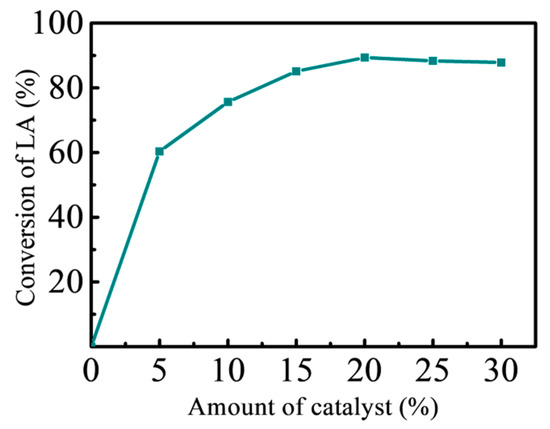 As shown in Figure 8, when the amount of catalyst increased from 5% to 20%, the yield of LA increased significantly. It can be explained by the fact that the reactants are exposed to more active sites due to the large increase of acid in the reaction system, so the reaction rate is accelerated and more target products are formed at the same time. However, as the amount of catalyst continued to increase, the yield of LA decreased, possibly because the presence of too many catalysts reduced the contact between reactant molecules in a state where the active center was essentially saturated. So, 20% of the amount of acid as the reaction condition was chosen.