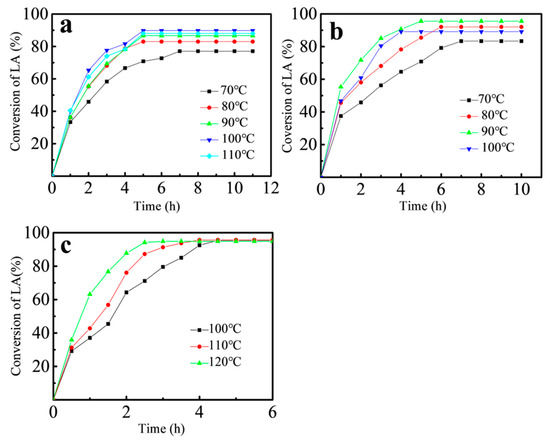 In order to optimize the reaction conditions of esterification, Fe3O4-PDA-SO3H catalytic activity was evaluated in the esterification of LA with ethanol, n-butanol, and n-caprylic alcohol, respectively. The reaction system mainly includes 5 mmol of levulinic acid and 10 mL of alcohols. The catalyst mass is 0.116 g, which is 20% of the mass of levulinic acid. As shown in Figure 9a, after 5 h of reaction at 100 °C, the conversion of LA in the presence of the Fe3O4-PDA-SO3H was 89.80%. When catalyst was used on LA with n-butanol esterification, conversion of LA was 95.55% at 90 °C in Figure 9b. As can be seen in Figure 9c, after 4 h at 110 °C, LA reacted with n-caprylic alcohol and conversion of LA was 95.65%. The optimum reaction temperatures of levulinic acid and ethanol, n-butanol, and n-octanol were 100 °C, 90 °C, and 110 °C, respectively.