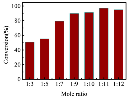 The effect of acid: Alcohol mole ratio on the esterification of LA at 5 mmol of levulinic acid, 10 mL of n-butanol, 0.116 g of catalyst, temperature (90 °C), and reaction time (5 h). As shown in Figure 10, under the same reaction conditions, the molar ratio of different acid to alcohol has a greater effect on the esterification. With 50.57%, 55.52%, 79.17%, 89.74%, 91.18%, 96.88%, and 95.00% of LA conversion observed for acid: Alcohol ratio 1:3,1:5,1:7,1:9,1:10,1:11,1:12, respectively. The experimental results showed that the conversion rate of LA can be improved by increasing the molar ratio of acid to alcohol to a certain extent. When the content of n-butanol in the reaction system exceeded the optimal amount, the conversion rate of LA did not increase and almost stabilized. Mole ratio 1:11 of LA to n-butanol was the optimum molar ratio.