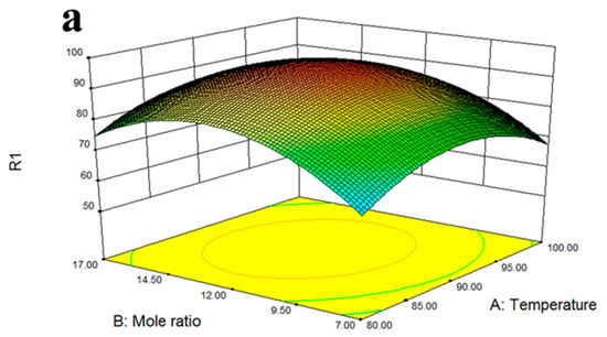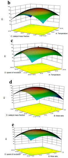 After the response surface software was designed, the solid acid catalyst was used to catalyze the esterification of levulinic acid with n-butanol according to the experimental scheme. Based on the response surface optimization method, the effects of two interaction parameters on the response value R1, the conversion rate of levulinic acid was shown in Figure 11, were plotted using Design Expert software.