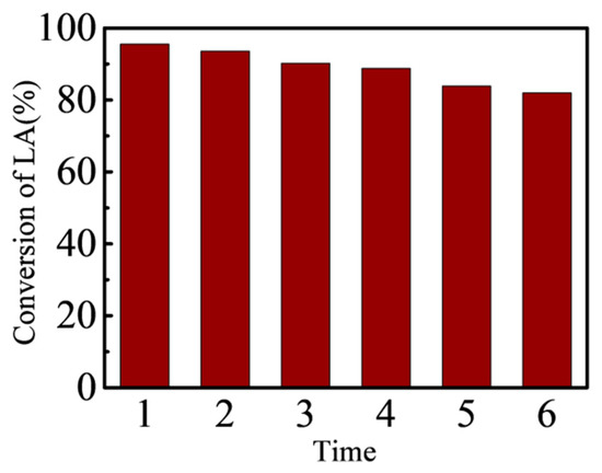 The reusability and recovery of the catalyst are important issues for the catalytic reactions. The results of repeated use of magnetic nanometer solid acid catalyst Fe3O4-PDA-SO3H for the esterification of levulinic acid and n-butanol are shown in Figure 12. After the reaction time was 5 h at 90 °C, the conversion rate of levulinic acid could reach 95.55%. After an esterification reaction, the solid acid catalyst was separated from the product by magnetic separation. It was washed with ethanol then, dried at 40 °C. The experimental results showed that the catalyst can still catalyze reaction effectively after being used for six times.