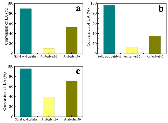 Different catalysts for the esterification of levulinic acid with (a) ethanol operated at reaction temperature: 90 °C, reaction time: 5 h, and catalyst mass: 0.116 g, (b) n-butanol operated at reaction temperature: 90 °C, reaction time: 5 h, and catalyst mass: 0.0266 g 0.0463 g, and (c) n-octanol operated at reaction temperature: 90 °C, reaction time: 5 h, and catalyst mass: 0.0463 g.