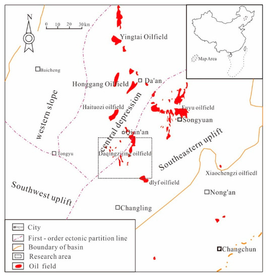 The Qingshankou Formation was formed from the first overall sinking and expansion of the Songliao Basin, and with obvious ‘rushed beginning, slow ending’ characteristics. Daqingzijing Oilfield lies in the center of Changling. The central depression area is in the south of Songliao Basin. The Changling Depression consists of two secondary depressions. One is the Qian’an Secondary Depression in the north and the other is the Heidimiao Secondary Depression in the south. The Daqingzijing Structure is on the middle of the two secondary depressions, clamped by Huazijing Terrace and Da’an-Honggang Terrace in the east and west. Daqingzijing Oilfield is interlinked with Qian’an Oilfield in the northeast and interlinked with the Qian 133 well area of Huazijing Terrace. In the south of the oilfield there is the south area of Heidimiao and in the northwest there is the Haituozi Oilfield of Da’an-Honggang Terrace (Figure 1). All these factors make Daqingzijing Oilfield an ideal regional tectonic location for rich oil and gas sources. Daqingzijing Oilfield is also a grand lithologic reservoir group of the Jilin Oilfield with over 100 million tons of oil and gas equivalent reserves [4,5].