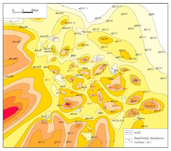 The core sequence directly presents the superposition relationship and characteristics of the sand bodies in isolated bars. The core shows that the sandstone lithology is mainly fine sandstone and siltstone, part of which is oil-spotted sandstone or oil-soaked sandstone. The bars are in gradual contact with mudstone at the bottom and in sharp contact at the top with a characteristic of obvious reverse rhythms from bottom to top. The bottom has mainly developed into wavy and lenticular beddings and is distributed as lacerate mud chips, deformation structures, nodules, and politic strips. The medium and upper parts are mainly made up of siltstone with wave-ripple beddings and water-ripple beddings, fine sandstone with parallel beddings, and mid-fine sandstone with low-angle cross beddings. Lamina of charcoal appears in some of sandstone members with occasional nodule developments. The thickness of the sand layers is between 2.5 m and 3m, with the thickest one being up to 8.7 m (Figure 3). Mudstone is dark grey and ash dark, and the thickness varies with various mudstone layers, which are mainly effective interlayers.