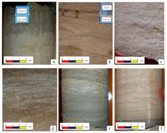 Photographs of cores of storm sediments. (a) Qing3-3, 2417.35m, scouring filling structure; (b) H169,2341.3m, hummocky cross bedding; (c) H169,2350.1m, hummocky cross bedding; (d) H169, 2342.5m, hummocky cross bedding; (e) H84, 2457.8m, slot mold structure; (f) H102, 2419.1m, wave ripple cross bedding.