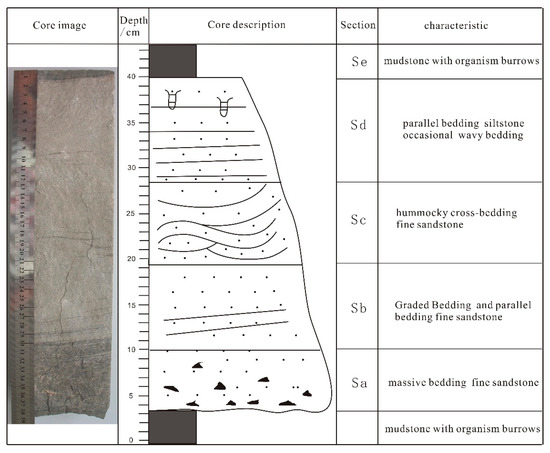 The storm etching structures are various etching filling structures which are formed because of storm flows scouring and sapping sediments (Figure 4a). Scouring-filling structures remaining at the bottom of sediments are important signs to help identify tempestites [12,13,14,15]. Generally, hummocky cross beddings are sedimentary structures formed due to storm waves’ impact (Figure 4b–d), which is an outstanding feature of storm sediments [10]. Since a storm flow is a density current, numerous small burdens and ball-and-pillow deformation structures are founded in storm sediments in the Daqingzijing area (Figure 4e). They formed very thin deformation structural strata and were clamped in tempestites. Ripple marks on the top surface of lake tempestites are mostly symmetric and slightly asymmetric. The appearance of wave-ripple beddings is a sign of wave activities, and ripple marks in deep water are the evidence for the impact of storms (Figure 4f).