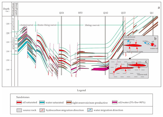For a lenticular reservoir with low permeability, the faulting system is a main pathway for hydrocarbon migration [20]. The development of a faulting system determines the reservoir type and plane as well as its vertical distribution characteristics. On the west slopes and the central fault belt of Daqingzijing Oilfield, the faulting system has developed well. In the reservoir developing zone, the hydrocarbon migration amount is sufficient and larger capillary resistance can be overcome in the process of hydrocarbon migration. In addition, oil and gas expulsion is relatively complete. In this case, hydrocarbon accumulation is a lot more demanding for traps, which shows that reservoirs in the west slopes were mainly formed in fault structures, while on the east slopes of Daqingzijing Oilfield, the faulting system is relatively undeveloped and the hydrocarbon migration amount is not sufficient, which provides a much lower capacity for oil to expulse water. In the precondition of some certain capillary resistance, oil is not able to expulse water effectively in a certain range. This determines that the reservoir type on east slopes transforms gradually from lithologic structural reservoir to fault lithologic reservoir, eventually to lithologic reservoir. The oil-water relationship in each set of oil-bearing series is complicated (Figure 9a).