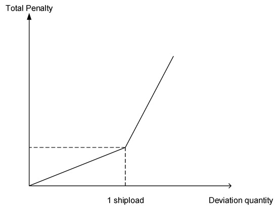 Based on the principles discussed above, we set a monthly penalty for over-delivery at $45/m and at $330/m for under-delivery. The annual penalty for over-delivery below one shipload is $10/m and $500/m for over-delivery exceeding one shipload. For under-delivery below one shipload, the penalty is set at $14/m and at $700/m for all under-delivery that exceeds one shipload.