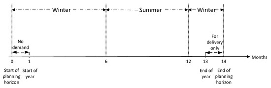 The whole planning horizon is illustrated in Figure 7. The planning horizon consists of 12 months plus one additional month before and after the 12 months period, 14 months in total. The first month of the planning horizon is used to initialize the problem. At the beginning of month 1, all carriers of type A are located at the production port and all carriers of type B are available at the transshipment port. Initial inventory levels are set to 50% of the available storage capacity at the production port and 0 for the transshipment port. There is no customer demand during month 1, but departures can be scheduled to deliver LNG to customers in month 2 and/or build inventory at the transshipment port to serve customers from there.