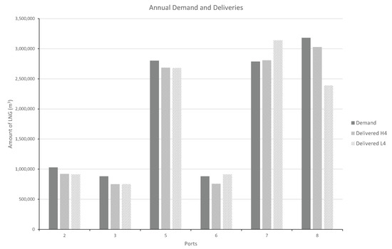 When comparing the number of port calls, the two solutions appear to be similar. With respect to the long-term customers in Asia (ports 2, 3, 5 and 6), both solutions deliver the same number of shiploads to ports 2 and 3. The L4 solution delivers one additional shipload to each port 5 and 6. For the European customers however, H4 delivers fewer shiploads to port 7, whereas L4 delivers considerably fewer shiploads to port 8. The differences are even more pronounced when considering the volumes delivered to the long-term customers. See Figure 8 for a comparison of annual demand of long-term customers and deliveries to these customers for the two solutions.